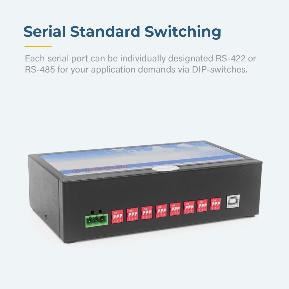 The USB-8COMi-M is a self-powered USB to RS-422 serial adapter device, but it also includes a 5V / 2Amp power supply for applications with high power consumption needs. This device offers Plug-and-Play installation features and RS-422/RS-485 device connection. Serial signal operation modes are selected by the eight DIP switches located externally for easy RS-422, RS-485 communication.