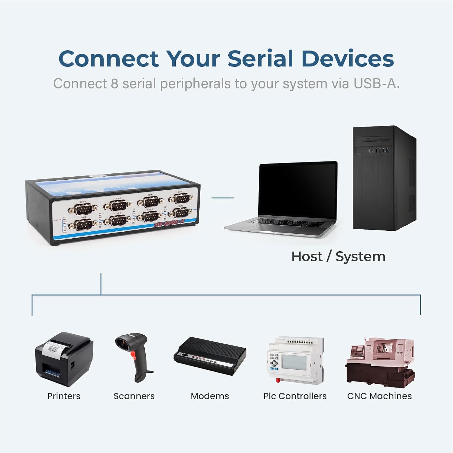 The USB-8COMi-M allows you to add 8 USB to RS-422 or RS-485 serial ports by connecting to a host USB port. Constructed from a rugged industrial-grade metal chassis to include industrial applications.