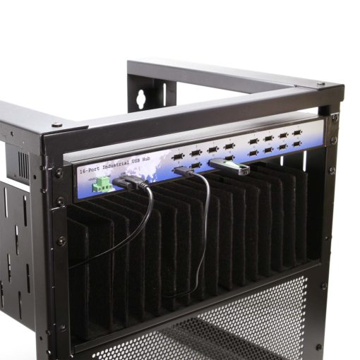 The Rack-Mountable Industrial 16-Port hub supports USB 2.0 full speed of 12 Mbps and USB 1.1 low speed 1.5 Mbps. It is powered by an industrial-grade switching power supply, and each downstream port provides full 500mA power to the connected USB devices. the USB HUB-1600i-RM incorporates hub chips for industrial usage with normal operation in wide ambient temperature from -40°C to 70°C operation in a harsh environment. All the USB signals are protected by 15KV ESD protection.
